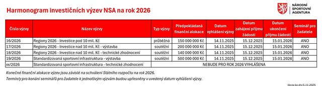 Pro rok 2026 vypsala k dnešnímu dni Národní sportovní agentura dosud několik investičních a neinvestičních programů. https://nsa.gov.cz/dotace-investicni/ a https://nsa.gov.cz/dotace-neinvesticni/ . U těch investičních, které obce zajímají především, jsou zatím alokace velmi nízké, jako v předešlých letech. Ale více prostředků NSA použít nemůže, protože je limitovaná státním rozpočtem. V případě navýšení kapitoly rozpočtu pro NSA mohou být alokace pro investiční dotační programy posíleny. Sportovní organizace ČR požádaly vládu a nastupující vládní garnituru o navýšení investic o 2 mld. Kč pro rok 2026. Otázkou je, jak reálné bude při stavu rozpočtového deficitu takový požadavek naplnit. Bude to otázka priorit.